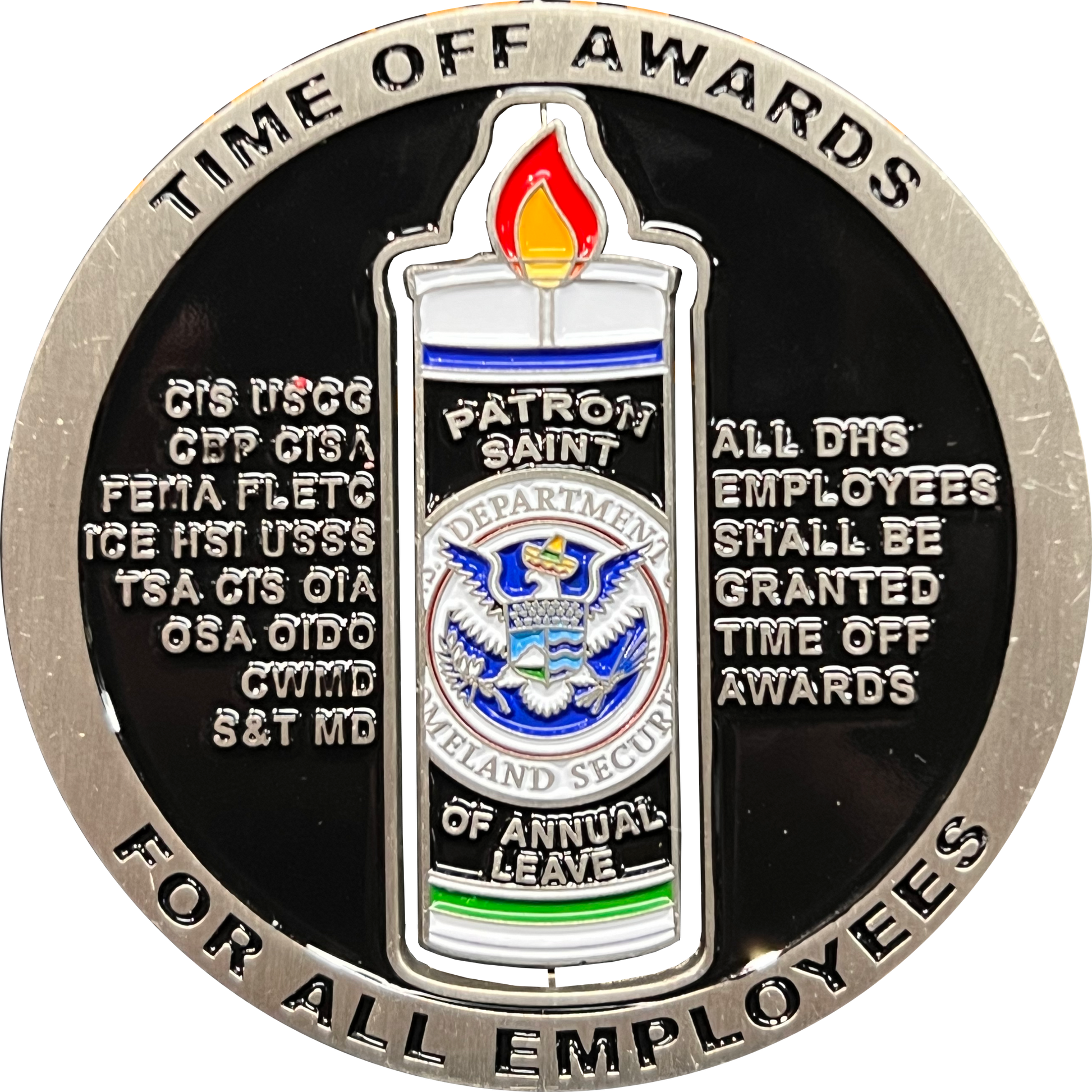 The original Version 1. Large 2.5 inch challenge coin with prayer candle spinner. DHS Secretary Mayorkas, Patron Saint of Leave. Also available in a new larger size as Version 2 sold separately. ULMG-3524
